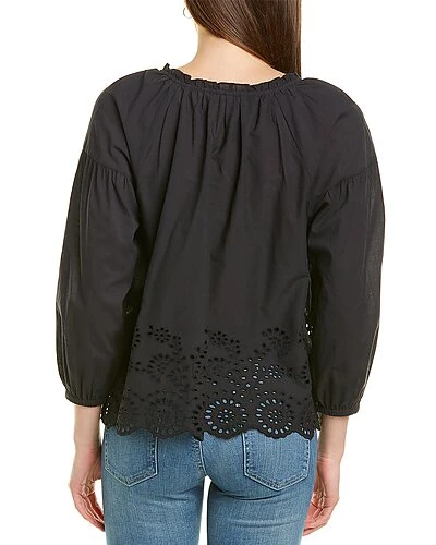 - 3/4-Sleeve Split Neck Top in black with ruffle neckline, dropped-shoulder sleeves, and eyelet scallop hem