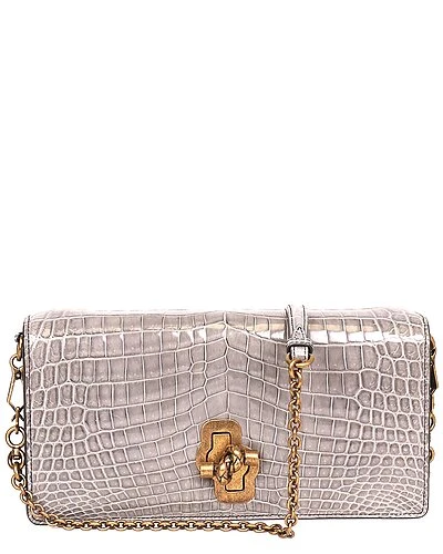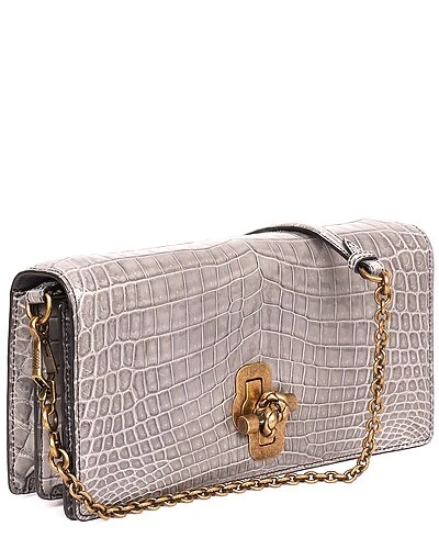 - Snake-Embossed Leather Clutch in grey leather and silver-tone hardware with clasp closing and chain strap