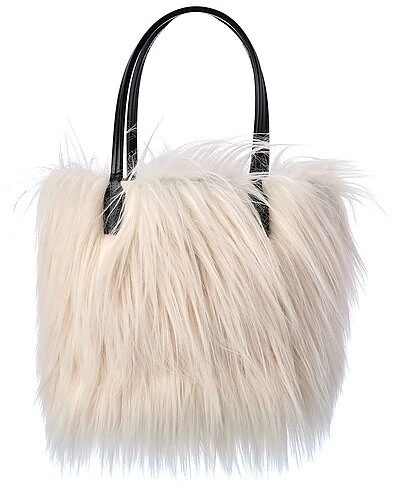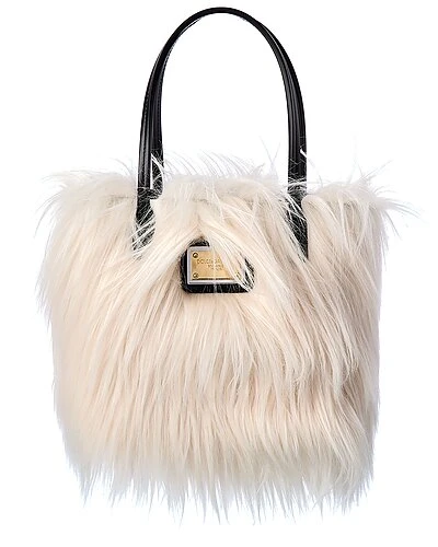- Small Shopper Tote in white faux fur and black leather and gold-tone and silver-tone hardware with logo plaque
