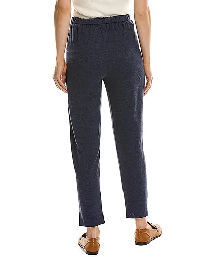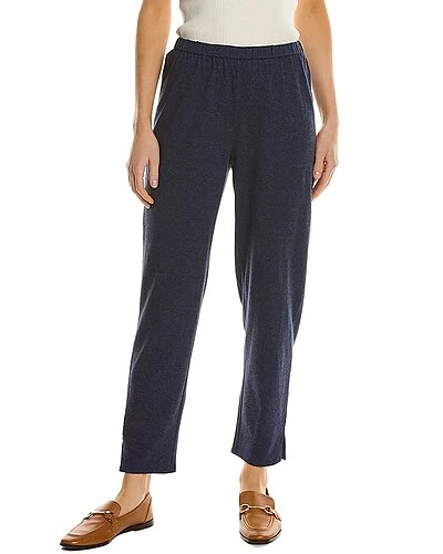 - Melange Tapered Pant in iris with elasticized waistband, side slits at hem, and darted back