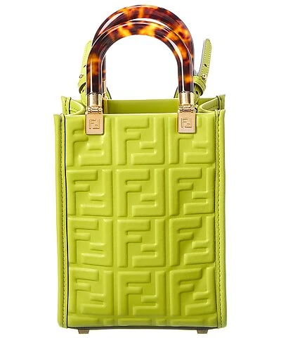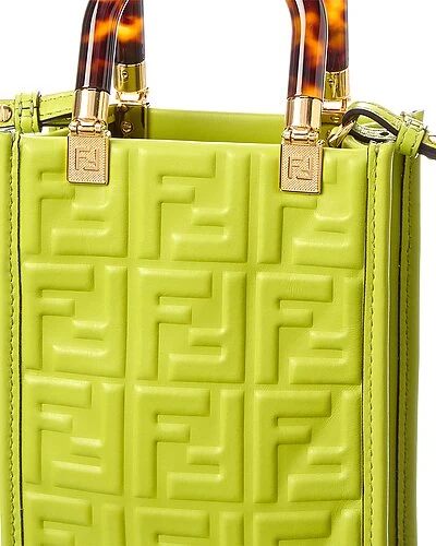 - Sunshine Mini Leather Tote in acid green FF motif leather with gold-tone hardware and Plexiglas top handles