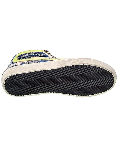 - Slide Satin & Leather Sneaker in blue satin and white leather and suede and silver-tone hardware with bead embellishments, printed laces and zipper accent