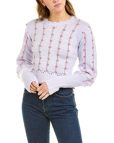 - Design details: metallic striping and dropped-shoulder blouson sleeves