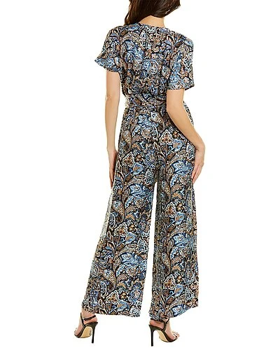 - Marea Silk-Blend Jumpsuit in black & blue with dolman sleeves, elasticized waist, dual side on-seam pockets, and self-tie sash at waist
