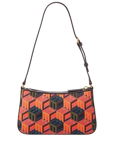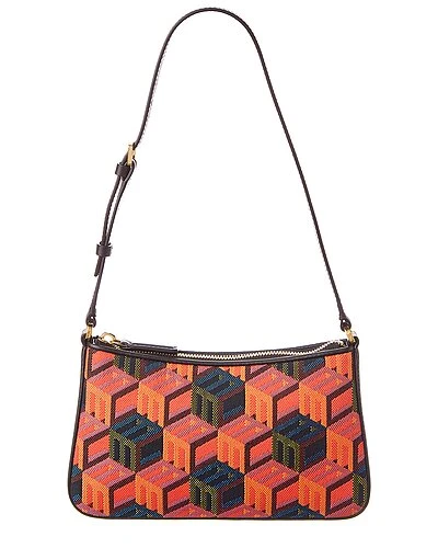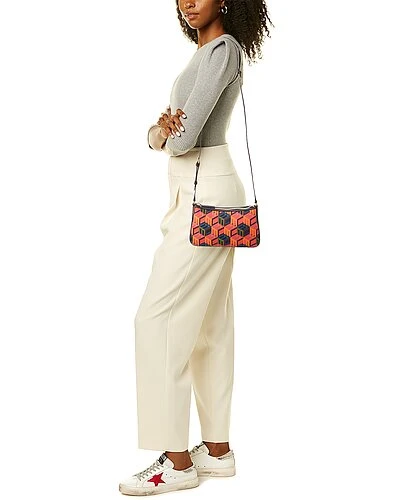 - Cubic Monogram Jacquard & Leather Crossbody in red cubic monogram jacquard and black leather and gold-tone hardware