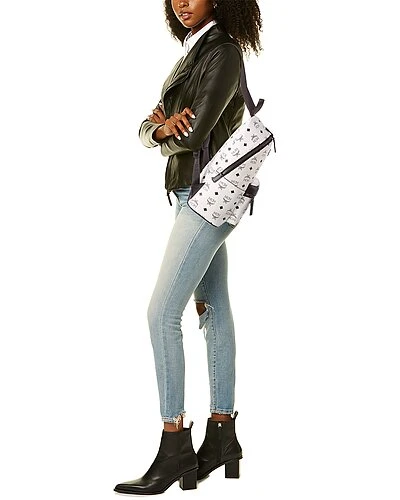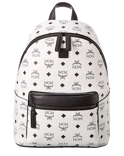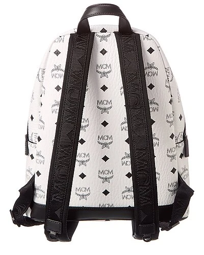 - Stark Small Visetos & Leather Backpack in white visetos monogram synthetic leather and black leather and matte black hardware with zippered pocket and logo taping straps