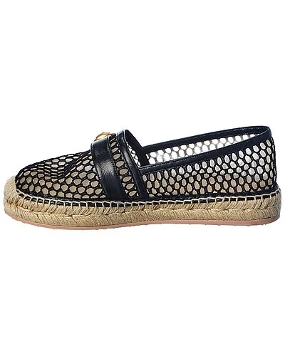 - Mesh & Leather Espadrille in black and white mesh and leather and gold-tone hardware with round buckle and jute trim