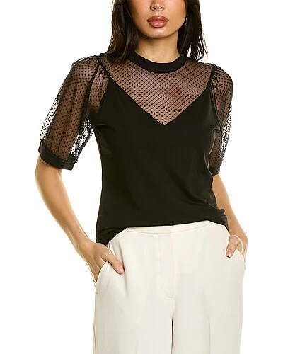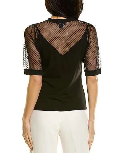 - Sheer Mesh Trim Top in black with tulle illusion neckline and elbow-length sleeves