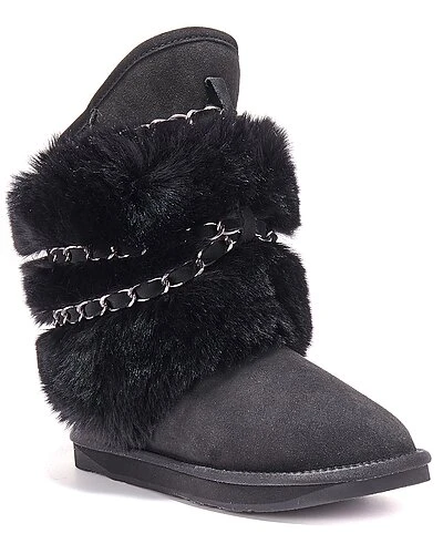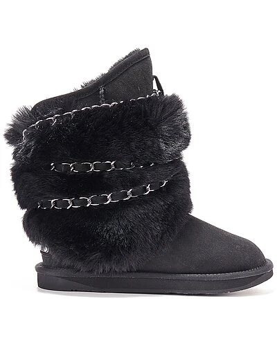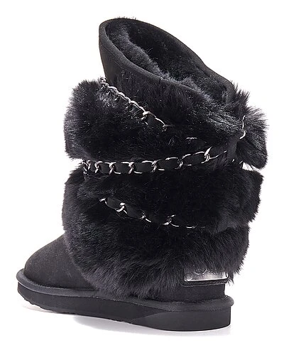 - Atilla Short Sheepskin Boot in black sheepskin and silver-tone hardware with luxe faux fur trim, leather and chain detail