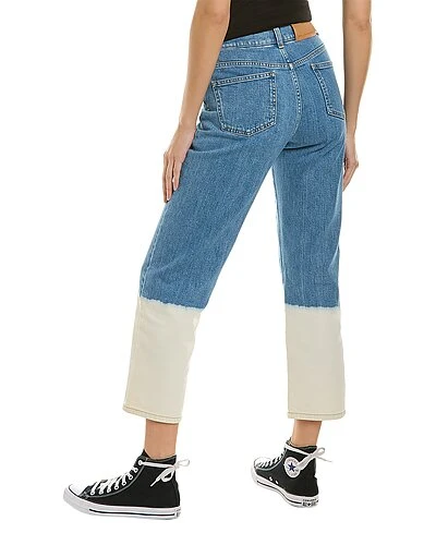 - Faded Hem Trouser in blue with fading and whiskering wash, classic five-pocket style, and belt loops