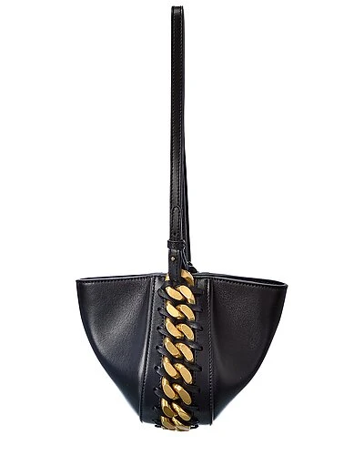 - Chunky Chain Bucket Bag in black vegan-friendly faux leather and gold-tone and silver-tone hardware with chain trim and logo charm