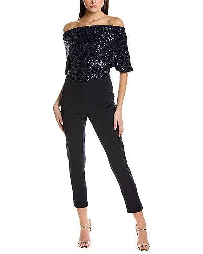 - Athena One-Shoulder Jumpsuit in navy with draped sleeves