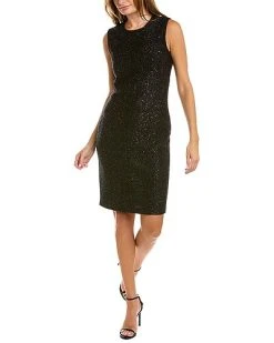 - Tweed Knit Sheath Dress in black & gold with fuzzy sequined design and vented back hem