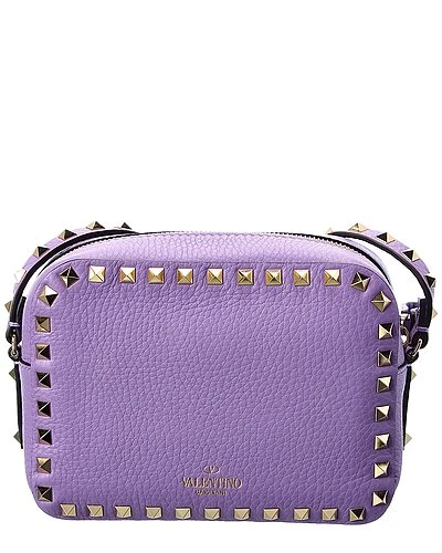 - Rockstud Leather Camera Bag in purple grainy leather with platinum finish rockstuds