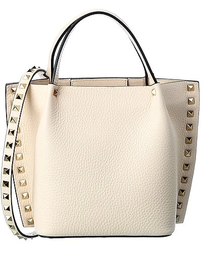 - Rockstud Grainy Leather Tote in white grainy leather with platinum-finish rockstuds