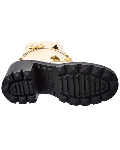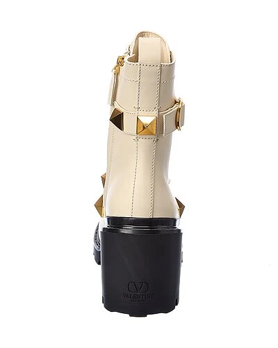 - Roman Stud 85 Leather Combat Boot in ivory leather and gold-tone hardware with Roman studs and buckle accent