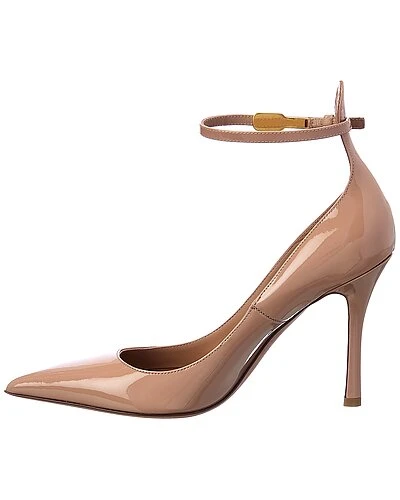 - VLogo 100 Patent Pump in pink patent leather and gold-tone hardware with VLogo buckle and pointy-toe