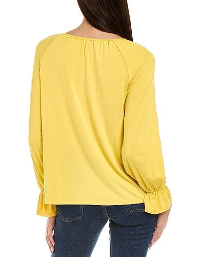 - Ruffle Cuff Knit Top in pale lemon with gathered neckline and raglan sleeves