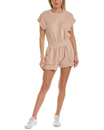 - Washed Texture Terry Romper in sandstone with elasticized waistband, open back, two front pockets, right back pocket, and raw edge hem
